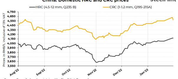 China’s domestic CRCs prices fell by RMB 60/t ($9/t) d-o-d while prices of HRCs remained unchanged today. Current offers-