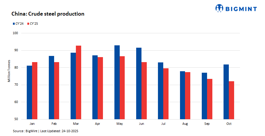 China’s crude steel production in October 2025 stood at 72 million tonnes (mnt), down by 12.1% y-o-y as compared to 81.88 mnt in October 2024, according to data from the National Bureau of Statistics (NBS).