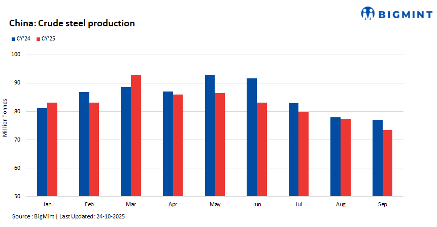 China’s crude steel production in September 2025 stood at 73.49 million tonnes (mnt), down by 4.6% y-o-y as compared to 77.07 mnt last year, according to data from the National Bureau of Statistics (NBS).