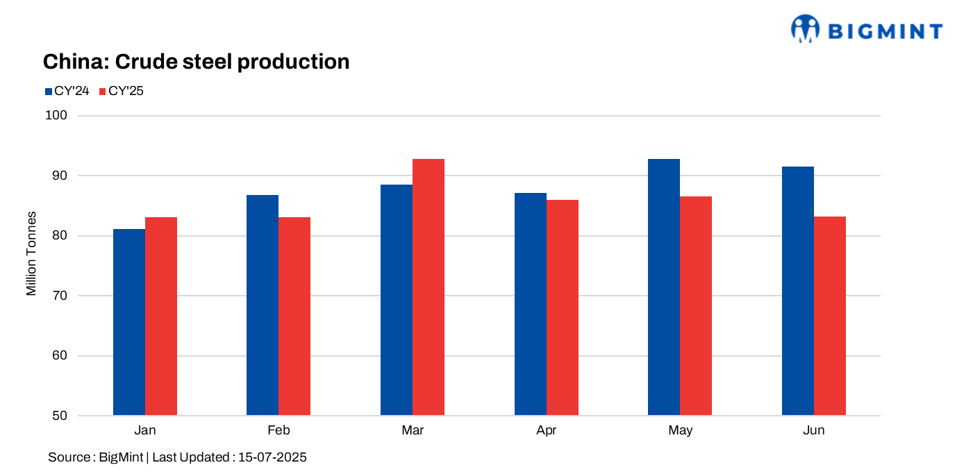 For June 2025 alone, crude steel output reached 83.18 million tons, reflecting a notable 9% y-o-y drop compared to 91.61 mnt in the same month last year. In May 2025, the production volume stood at around 86.55 mnt.