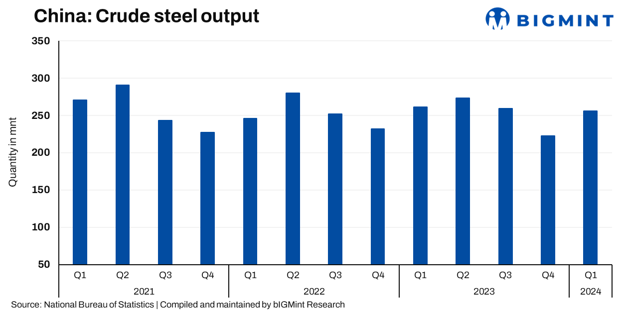 China’s crude steel production for Q1 CY’24 (January-March 2024) decreased by 1.9% y-o-y to 256.55 million tonnes (mnt) as compared to 261.68 mnt in Q1 CY’23, as per the data provided by the National Bureau of Statistics (NBS). Moreover, the same declined by 7.8% y-o-y to 88.27 mnt in March 2024 against 95.73 mnt in March 2023.