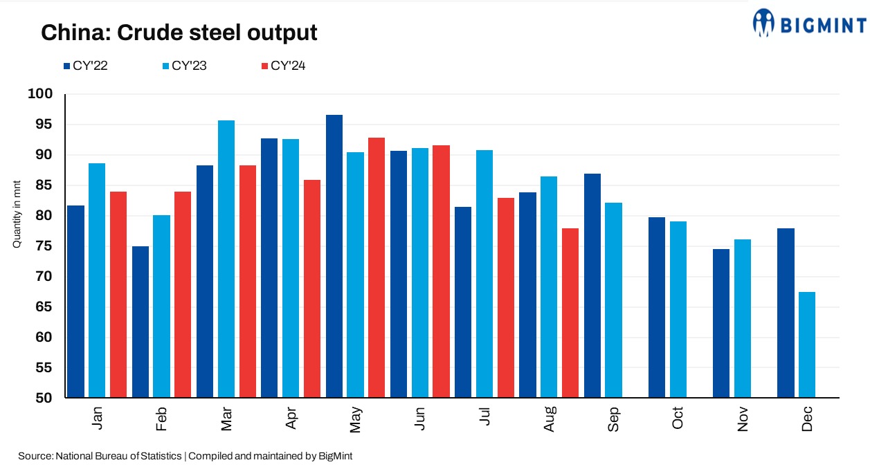 China’s crude steel production for August 2024 stood at 77.92 million tonnes (mnt), reflecting a 10.4% y-o-y decline compared to 86.41 mnt in August 2023, according to data from the National Bureau of Statistics (NBS). Additionally, production fell by 6.1% m-o-m compared to 82.94 mnt in July 2024.