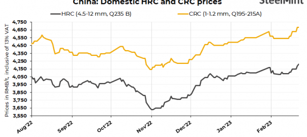 SHFE HRCs futures for May’23 delivery closed today at RMB 4,296/t ($623/t), stable d-o-d.
