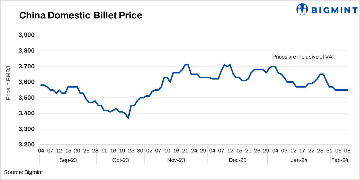 - Billet prices in Tangshan remained firm for the fourth straight day at RMB 3,550/t ($499/t) on 8 Feb’24. Prices include 13% VAT.