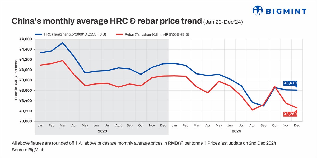 Tangshan’s benchmark HRC prices, available with BigMint, remained flat m-o-m in November at RMB 3,610/t ($496/t) while rebars fell 3% to RMB 3,260/t ($448/t).