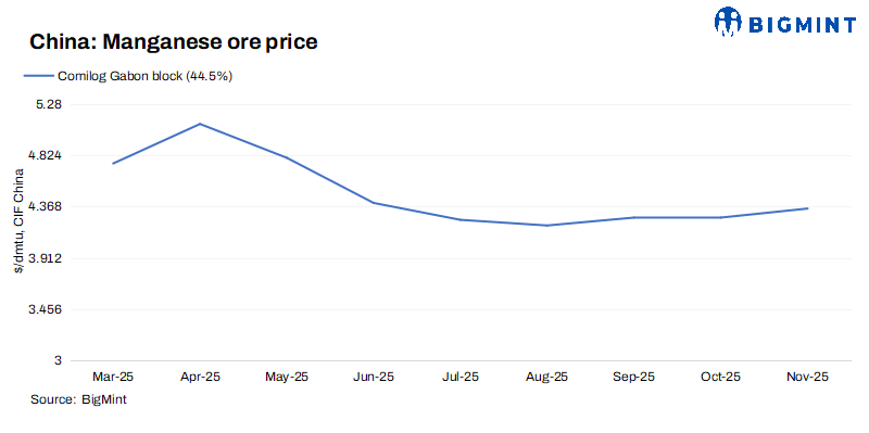 Eramet Comilog, a leading manganese ore exporter from Gabon, has set its Nov’25 shipment prices at $4.35/dmtu CIF China for Mn44.5% lumps and $4.15/dmtu for Mn43%, both up by $0.08/dmtu m-o-m, supported by firm Chinese demand and tightening supply.