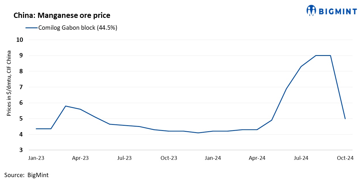 Eramet Comilog, a major manganese ore exporter from Gabon, has adjusted its pricing for Oct’24 shipments to China. The revised price for Mn 44.5% Gabonese lump is $5.00/dmtu CIF China, down $1.00/dmtu from the September offer. Similarly, the price for 43% grade Gabonese chips has been reduced to $4.80/dmtu CIF China, also reflecting a $1.00/dmtu decrease.