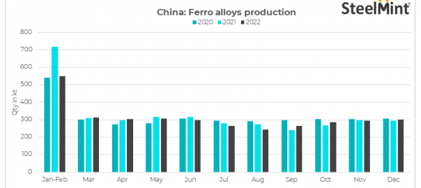 China’s ferro alloys production decreased by 2% y-o-y to 34.1 mnt in CY’22, according to National Bureau of Statistics (NBS) data. Output dropped due to production cuts amid weak demand. In Dec’22, China produced 3 mnt of ferro alloys, up 1% compared to Nov’22 amid good demand prior to the New Year holidays.