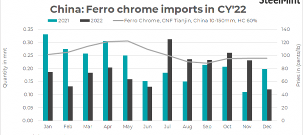 - High carbon ferro chrome imports into China fell by 9% y-o-y to 2.38 mnt in CY22 compared to 2.63 mnt in CY21.