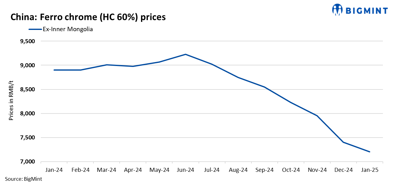 Weak chrome ore prices: The chrome ore market remained muted this week, with domestic spot prices softening to move within a limited range. Futures prices of chrome ore from Turkiye, Albania, Iran, Zimbabwe, and Pakistan also remained weak.