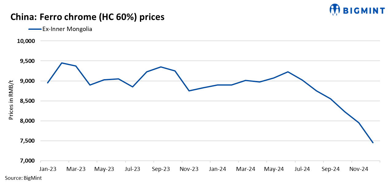 China: Ferro chrome prices edge down w-o-w amid declining demand, sluggish steel market