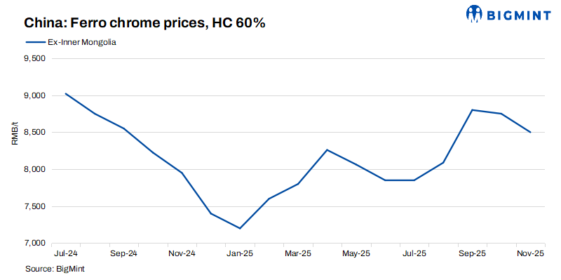 Domestic chrome ore inventories remained at moderate levels, with buyers making purchases cautiously on a need basis. Energy control policies continued to restrict production capacity, thereby curbing raw material demand.