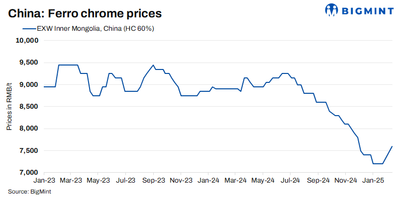 On 12 February, Mysteel assessed spot prices of high-carbon ferro chrome with 55% chromium content in North China’s Inner Mongolia at RMB 7,500/tonne (t) ($1,028.9/t) exw, including tax, higher by a sizeable RMB 400/t from just one month earlier.