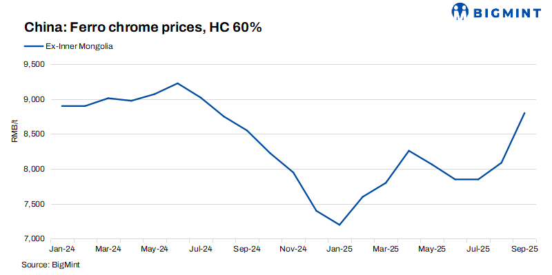 CBC: Chinese ferro chrome prices went up slightly over the week, supported by stable ore supply, cautious domestic buying, and growing demand for low-carbon grades from the new energy sector.