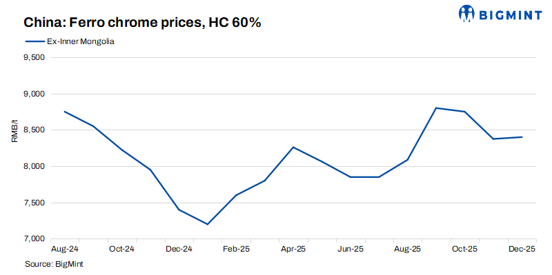 Ferro chrome prices inched up over the week due to cost pressures from chromium ore, coke price fluctuations, and expectations of tighter South African export policies, while demand remained mixed due to cautious procurement. Overall market sentiment stayed stable, with a wait-and-see approach prevailing.