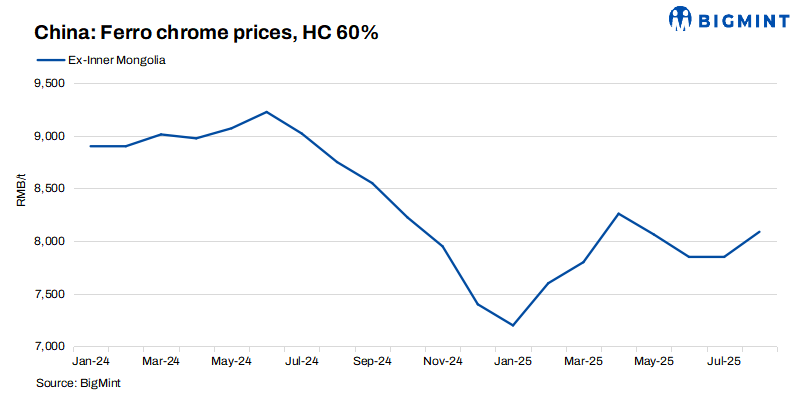 Demand from new energy sector grows: High grade ferro chrome consumption was supported by growing demand from the new energy sector, driven by the mass production of iron-chromium flow batteries and hydrogen electrolyser coatings, as well as expanding military and aerospace orders, providing key support for prices.