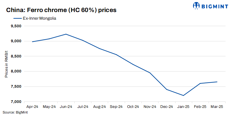 CBC: The Chinese ferro chrome market remained stable this week, with prices of the high-carbon grade at RMB 7,400-7,800/t ($1,023-1,078/t), up RMB 100/t ($14/t) w-o-w. Medium-carbon ferro chrome was steady w-o-w at RMB 12,000-12,200/t ($1,659-1,686/t) exw, including taxes. Reduced production at steel mills in southern China led to slower transactions and lower demand, contributing to a weak outlook in the short term.