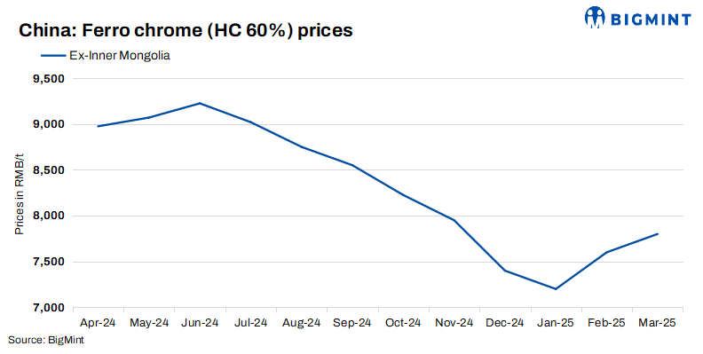 Chrome ore prices rise: Chrome ore saw a slight price increase w-o-w. South African chrome ore and high-grade chrome concentrate prices rose by RMB 1/t ($0.14/t) w-o-w. Overall pricing sentiment among miners remained firm, with minimal availability of low-priced sources. The higher prices were further reinforced by a slight but continuous rise in foreign futures transactions, which contributed to an optimistic outlook for the market.