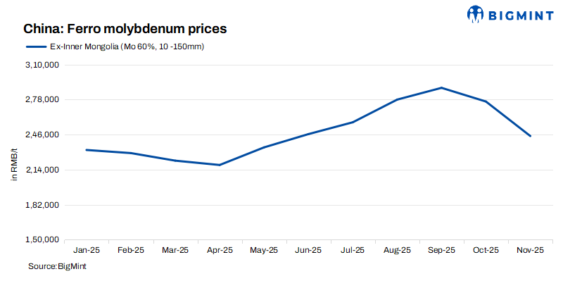 Mysteel Global: China’s prices of ferro molybdenum have steadily declined in he week beginning 24 Nov , with the price of 60% ferro molybdenum in Northeast China, a major production hub for the noble alloy, reaching RMB 232,000/tonne ($32,766/t) including the 13% VAT as of 27 November, falling by RMB 11,000/t ($1,554/t) week on week and marking the lowest since the third week of May, according to Mysteel’s assessment.