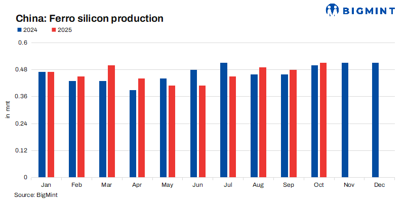 Mysteel Global: China’s ferro silicon output recovered in October after September’s decrease, with the total tonnage rising by 17,108 tonnes (t) or 3.5% m-o-m to a ten-month high of 505,338 t, according to Mysteel’s monthly survey of the 136 Chinese smelters under its regular tracking.
