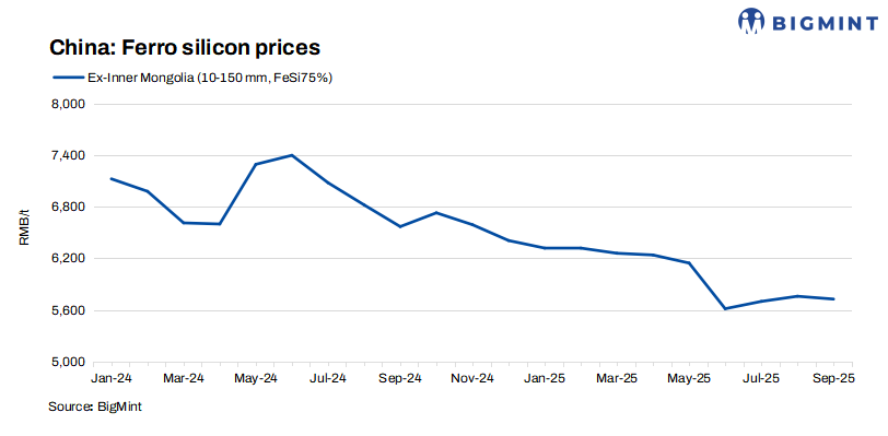 ZCE futures inch up: Ferro silicon futures on China’s Zhengzhou Commodity Exchange (ZCE) for November 2025 delivery edged up by RMB 130/t ($18/t) w-o-w to RMB 5,756/t ($/810t) on 18 September, compared to RMB 5,626/t ($791/t) on 11 September.