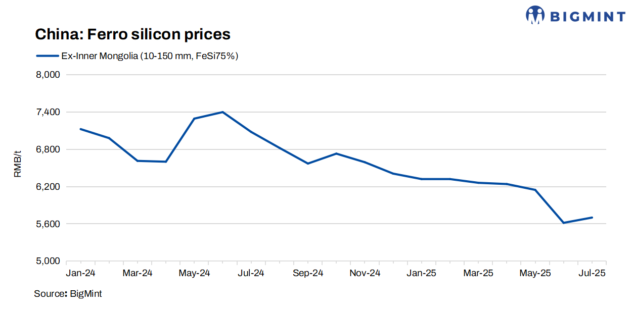 ZCE futures edge down: Ferro silicon futures on China’s Zhengzhou Commodity Exchange (ZCE) for September 2025 deliveries edged down by RMB 58/t ($8/t) w-o-w to RMB 5,696/t ($794/t) on 31 July compared to RMB 5,754/t ($802/t) on 24 July.