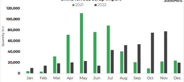 - China’s ferrous scrap imports stood at 0.42 mnt in CY’22 as compared to 0.50 mnt in CY’21, down by 16 % y-o-y, as per SteelMint data.