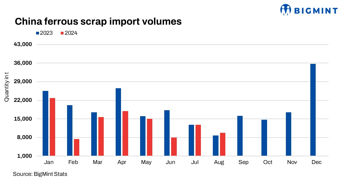 - China’s ferrous scrap imports fell 24% m-o-m to 9,739 t in Aug’24 from 12,764 t in Jul’24. However, imports rose 12% y-o-y from 8,722 t in Aug’23.