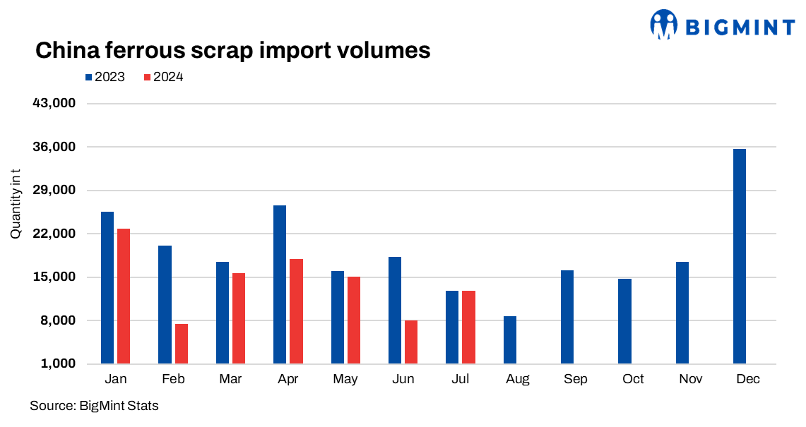 China’s ferrous scrap imports surged by 59% m-o-m reaching 12,764 t as compared to 8,009 t in Jun’24. Y-o-y, imports remained marginally stable at 12,764 t as compared to Jul’23. However, imports fell by 27% during Jan-Jul’24 totalling 99,531 t compared to 136,624 t in same period of last year. Japan remained the leading exporter at 6,112 t followed by South Korea and Myanmar at 3,301 t and 1,071 t respectively.
