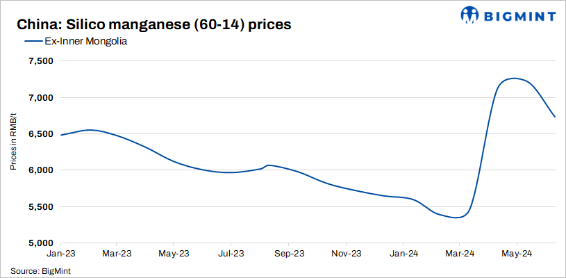 Hebei Iron and Steel (HBIS) Group floated a tender for procuring 14,100 t of silico manganese (65-17) for Jul’24. The price is down 3% m-o-m. Bids for Jul’24 delivery are at RMB 7,650/t ($1,052/t), down RMB 770/t ($106/t) m-o-m. All prices include taxes and freight. Silico manganese (65-17, 25-150 mm) spot prices as on 9 Jul’24 were at RMB 7,355/t ($1,011/t) exw-Inner Mongolia.