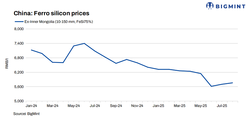 China’s Hebei Iron and Steel Group (HBIS Group) has released its ferro silicon bids for Aug’25. Bids (Si: 72%) stood at RMB 6,030/t ($840/t), reflecting a slight rise of RMB 430/t ($60/t) m-o-m from the Jul’25 tender price of RMB 5,600/t ($781/t). This price includes all taxes and freight charges to HBIS Group facilities.