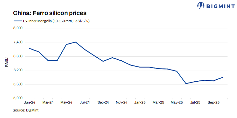 China’s Hebei Iron and Steel Group (HBIS Group) has released its ferro silicon bids for Oct’25. Bids (Si: 72%) stood at RMB 5,660/t ($794/t), reflecting a slight drop of RMB 140/t ($20/t) m-o-m from the Sep’25 tender price of RMB 5,800/t ($814/t). This price includes all taxes and freight charges to HBIS Group facilities.