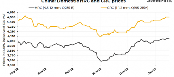 - HRC (4.5-12mm, Q235 B): RMB 4,100/t ($605/t)