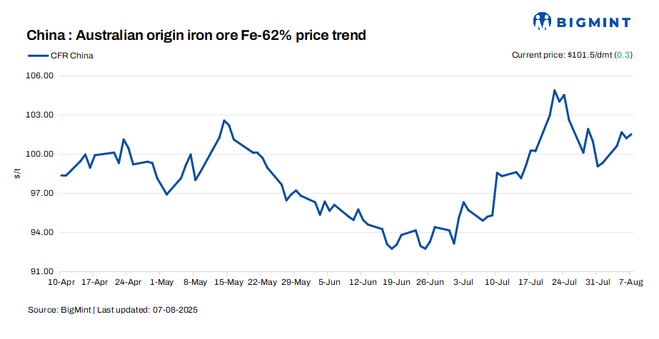 Iron ore fines (Fe 62%) spot prices inched up by $0.3/dmt to $101.5/dmt CFR China on 7 Aug’25. The market remained range-bound, driven by a wider spread that lifted seaborne high-grade fines, pressuring port-stock traders and causing import losses for Aug-Sep cargos. Weaker finished steel demand and a slight drop in iron ore imports impacted sentiment in China, but stronger macroeconomic data and trading activity helped limit the decline.