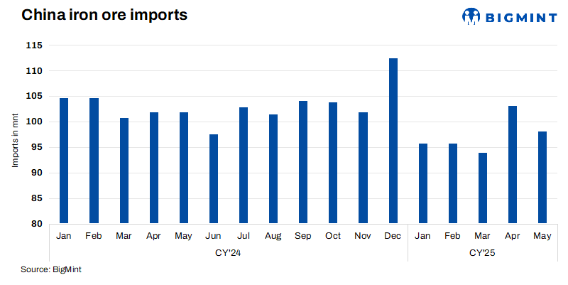 China: Iron ore imports dip by 5% m-o-m in May’25 amid soft demand, inventory pressure