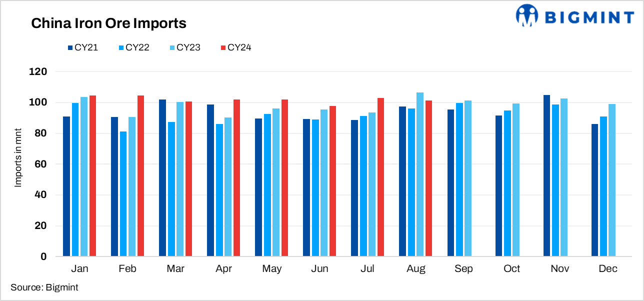 China’s iron ore and pellet imports touched 101.39 million tonnes (mnt) in August 2024, according to the General Administration of Customs. For the world’s largest iron ore consumer and importer, August’s imports marked a 5% decrease y-o-y from the 106.41 mnt registered in the corresponding period last year, driven by reduced hot metal production and higher portside stocks. On an m-o-m basis, the import volume for August 2024 remained largely stable as compared to July 2024.