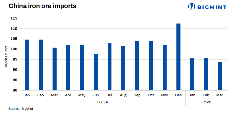 Iron ore imports from China are expected to recover in Q2CY’25, supported by seasonal demand improvement and anticipated policy support.