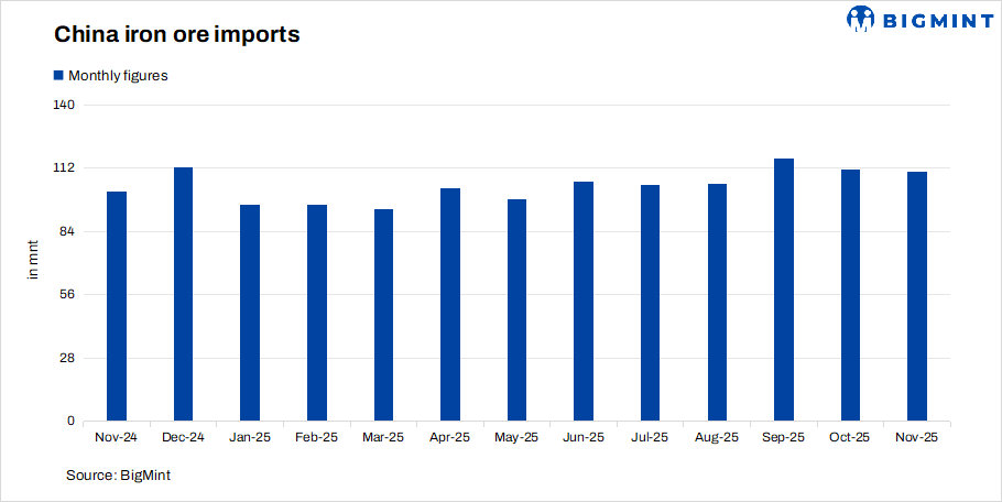 China’s iron ore imports stood at 110.54 million tonnes (mnt) in November 2025, slipping just 0.7% m-o-m from October’s record 111.3 mnt but rising 8.5% y-o-y. Despite the marginal dip, arrivals remained above the 100-mnt mark for the sixth consecutive month, underscoring sustained procurement needs from Chinese steelmakers. The near-steady m-o-m performance reflects a delicate balance between seasonal production slowdowns, cautious inventory management, and consistent seaborne supply, which collectively kept import volumes firm even as downstream steel demand remained soft.