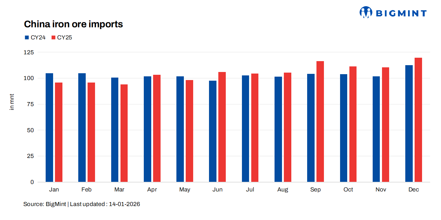China’s iron ore imports remained resilient in CY’25 at 1,260 million tonnes (mnt), rising 1.8% y-o-y to an all-time high from around 1240 mnt in CY’24, despite weak steel demand and margin pressure. Monthly arrivals averaged 105 mnt, staying consistently above the 100-mnt mark through most of the year. Even with cautious mill buying, stable seaborne supply and structural dependence on imported medium-grade fines kept annual inflows firm rather than contractionary.