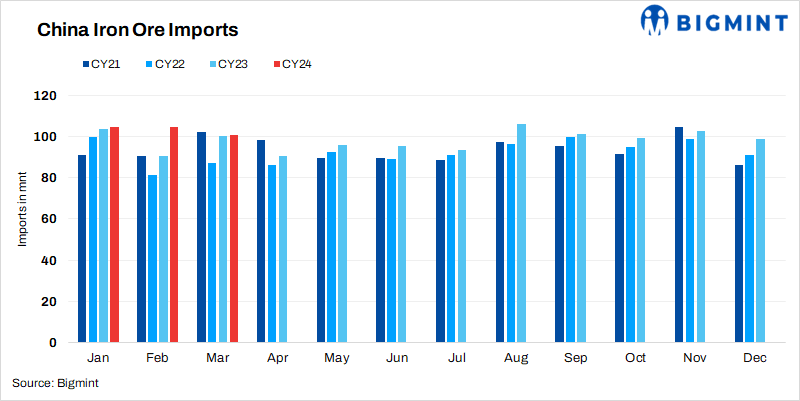 China: Iron ore imports rise 6% y-o-y in Q1CY’24
