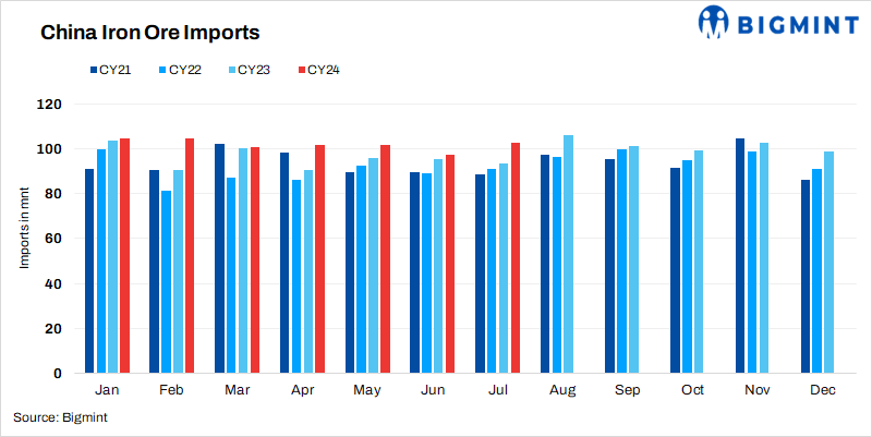 China, the world’s largest iron ore consumer and importer recorded iron ore and pellet imports at 102.813 million tonnes (mnt) in July, 2024, according to General Administration of Customs. The imports witnessed 5% m-o-m increase compared to 97.613 mnt in June, 2024. This increase is driven by robust market fundamentals and active procurement of cargoes at ports.