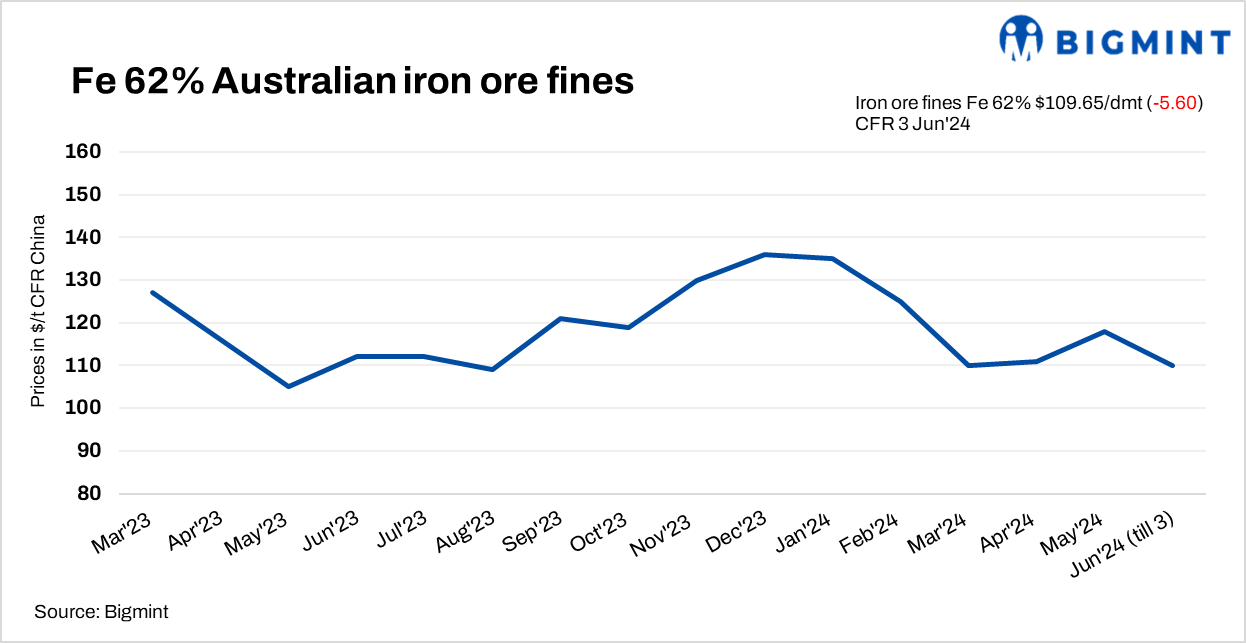 Spot prices of iron ore fines (Fe 62%) dropped significantly by $5.6/t d-o-d to $109.65/t CFR China on 3 Jun’24 amid weak market fundamentals. Recently, the Chinese government announced new regulations on steel production capacity and output control, so the market continues to feel the impact of this news.