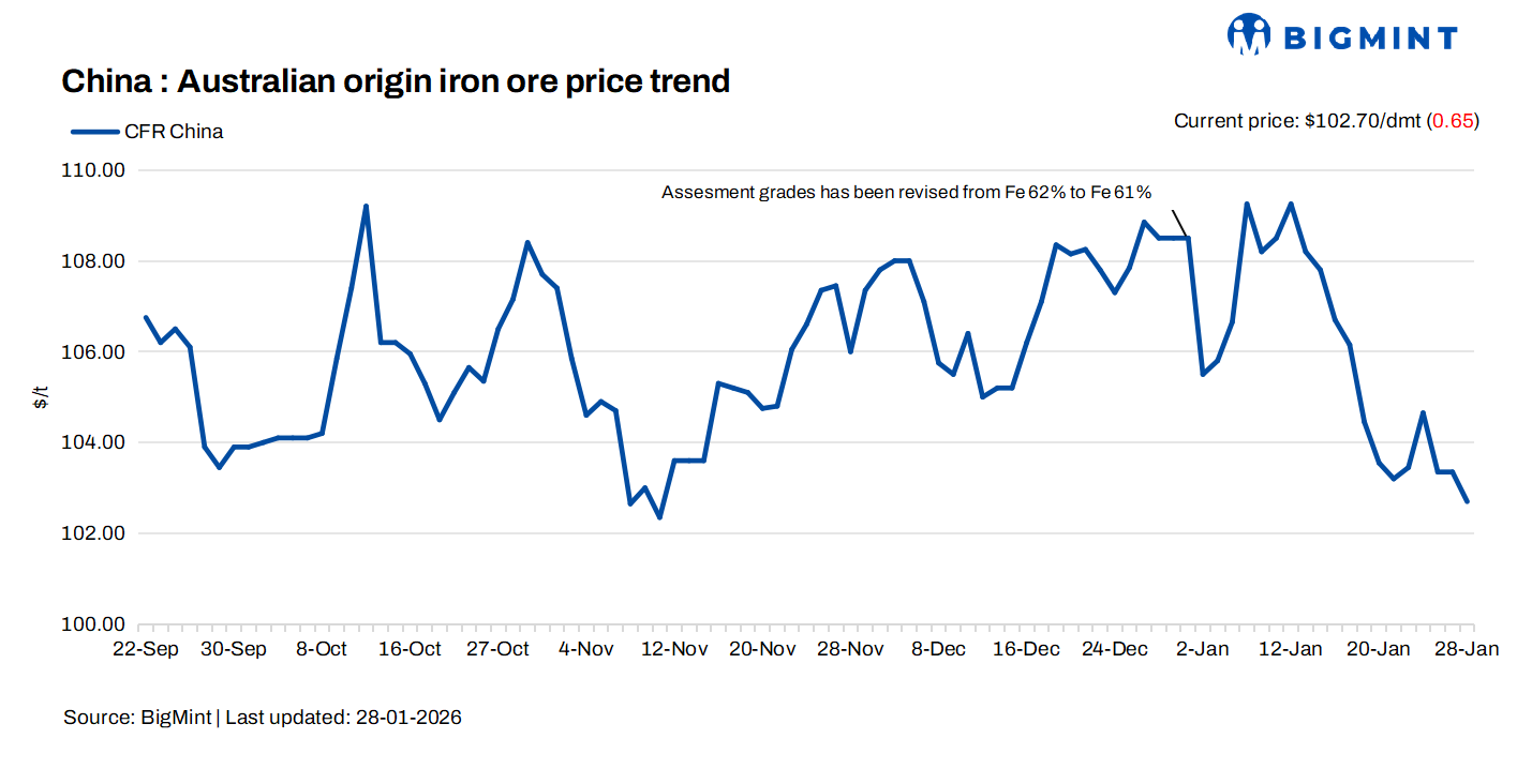 Iron ore fines (Fe 61%) spot prices showed a decline of $0.65/t to $102.7/dmt CFR China on 28 Jan’26. Trading was quiet ahead of the Lunar New Year, with thinner liquidity for Feb-Mar cargoes. Spot prices stayed stable on pre-holiday demand. Port buying showed mild improvement and sentiment stayed cautious, while stronger March cargo interest for post-holiday restocking kept the market in contango.