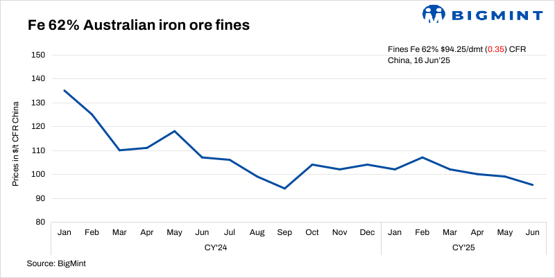 Iron ore fines (Fe 62%) spot prices inched down by $0.35/t d-o-d to $94.25/t CFR China on 16 Jun’25. Trading activity was slow but steady, primarily focused on medium-grade cargoes. Reportedly, mills made need-based purchases to replenish their lower inventory levels from earlier. Additionally, China’s port stock iron ore prices remained stable after a decline over the past few days.