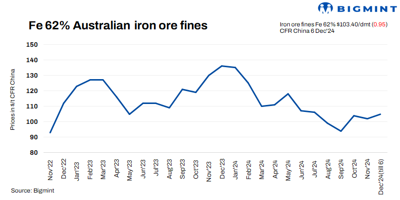 Iron ore fines (Fe 62%) spot prices fell d-o-d by $0.95/t to $103.40/t CFR China on 6 Dec’24 due to weakened demand from Chinese steel mills, driven by ongoing maintenance schedules for blast furnaces and reduced hot metal production. This has resulted in lower consumption of iron ore, while high inventory levels at ports have further intensified the supply-demand imbalance, pushing prices down.