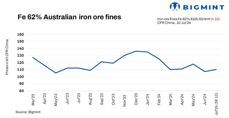 Iron ore fines (Fe 62%) spot prices dipped $4.10/t d-o-d to $105.50/t CFR China on 10 Jul’24 due to weak market fundamentals coupled with sluggish steel demand. Steel and raw material prices have dropped due to rainy weather in southern China amid expectations of macroeconomic reforms. In addition, steel mills that have recently experienced losses have opted for maintenance downtimes.