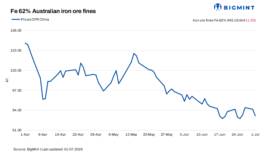 Iron ore fines (Fe 62%) spot prices declined by $1/t d-o-d to $93.15/t CFR China on 1 Jul’25. The decline was driven by reports of possible production curbs under tightened environmental norms. Lower sintering and pig iron output, along with production cuts in key hubs, weighed on sentiment. Moreover, subdued seaborne activity pointed to a prevailing bearish outlook.