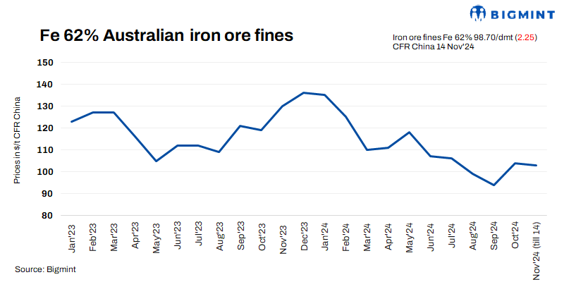 Iron ore fines (Fe 62%) spot prices fell by $2.25/t d-o-d to $98.70/t CFR China on 14 Nov’24 amid continued thin liquidity in the seaborne market. Weak downstream steel demand pulled down buying interest. Additionally, the recent depreciation of the USD/CNY exchange rate has raised the cost of seaborne cargo for Chinese buyers, narrowing landing margins and reducing purchasing activities.