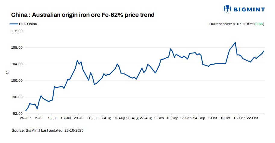 Iron ore fines (Fe 62%) prices inched up by $0.65/dmt to $107.15/dmt CFR China on 28 Oct as buying activity picked up slightly in the secondary market. The modest rise signals a brief recovery in sentiment, though fundamentals remain weak. As per reports, prices are expected to stay under pressure, with limited scope for sustained gains as demand concerns and supply adjustments continue to weigh on overall outlook.