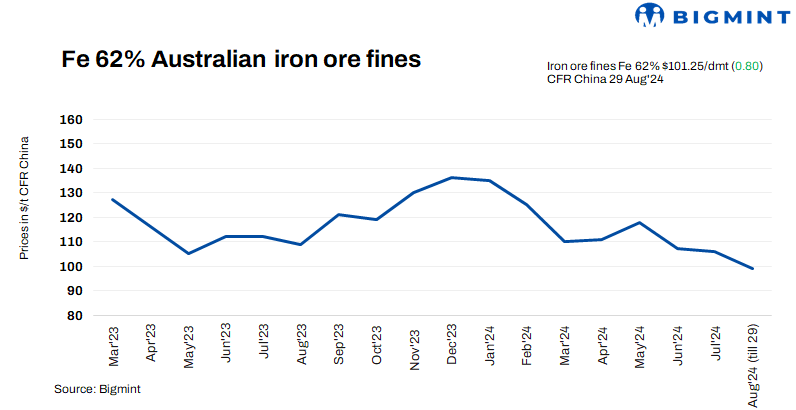 Iron ore fines (Fe 62%) spot prices rose by $0.80/t to $101.25/t CFR China d-o-d on 29 Aug’24 amid an improved trading activity. Recent seaborne market transactions were driven by trading demand despite low factory production intensity. Steel mill production levels slowly recovered, leading to an improved market sentiment and buying interest. Market participants are shifting their preferences towards October loading cargoes.